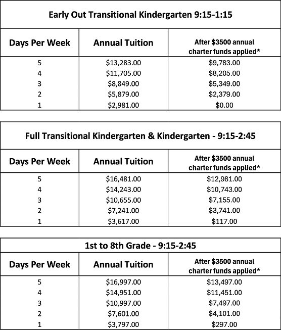 ** Tuition is prorated by academic week. Charter funds are prorated by days of attendance. *** Non-refundable Facilities, Admin and Insurance fee of $995 is due at enrollment. (Early bird price is $595 if enrolling by March 15)