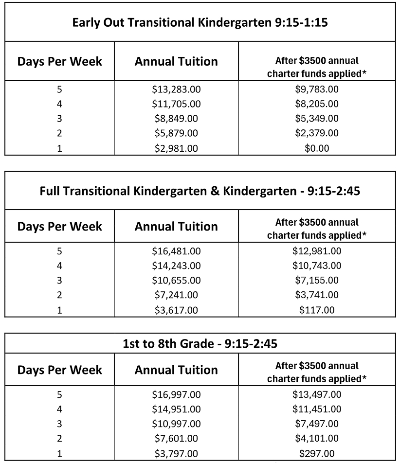 **Charter funds are administered outside of our control, and if they are cut, families are still responsible for full tuition. *** Tuition is prorated by academic week. Charter funds are prorated by days of attendance. **** Non-refundable Facilities, Admin and Insurance fee of $995 is due at enrollment. (Early bird price is $595 if enrolling by March 15) *****Non-refundable textbook/workbook printing fee per student due upon enrollment: $250 1 or 2 days per week $495 3 days per week $695 4 or 5 days per week